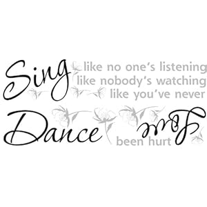 Product Description : From the ManufacturerSing like no one's listening, dance like nobody's watching, and love like you've never been hurt--these are words to live by. Add these beautiful phrases to any wall with this elegant set of stickers. Since each word and accent is individually cut, you can place each piece on walls, furniture, stairs, or any other smooth surface. You can even use the added decorative accents to spruce up other pieces or places in your home! Product Description : RMK1552SCS Sing like no one's listening, dance like nobody's watching, and love like you've never been hurt--these are words to live by. Add these beautiful phrases to any wall with this elegant set of stickers. Since each word and accent is individually cut, you can place each piece on walls, furniture, stairs, or any other smooth surface. You can even use the added decorative accents to spruce up other pieces or places in your home! Features: -Wall decal. -Peel and Stick laptop wear. -Repositionable and removable with no damage to walls or surface. -4 Sheets 10" x 18". -Comes with 16 elements. -Assembly required. -Made in the USA.