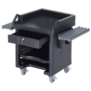 Product Description : This durable Cambro cart is perfect for your cashier station! Designed to hold computers and cash registers, it's equipped with an adjustable shelf that's perfect for your printer. There's a security cable anchor to keep your electronics safe and it's fully portable, so you can take it wherever you need it to go. This cashier cart is available with or without tray rails and it can be easily connected to other Cambro Versa bars or tables. Features: Durable construction with a stylish granite gray and black design. Optional adjustable tray rails. Designed to accommodate computers and cash registers. Includes standard or heavy duty casters for portability. Adjustable shelf perfect for printers. Security cable anchor to protect your electronics. Front panel for convenient electrical access. Fully compliant with NSF requirements. Easily connects to other Cambro Versa bars, tables, or carts (sold separately). . Specs: Dimensions with Dual Tray Rails: 52 3/4"W x 43"H x 32 1/4"D. Dimensions without Tray Rails: 32 1/4"W x 43"H x 32"D. . Ships within 3 business days. One year warranty on parts and labor.